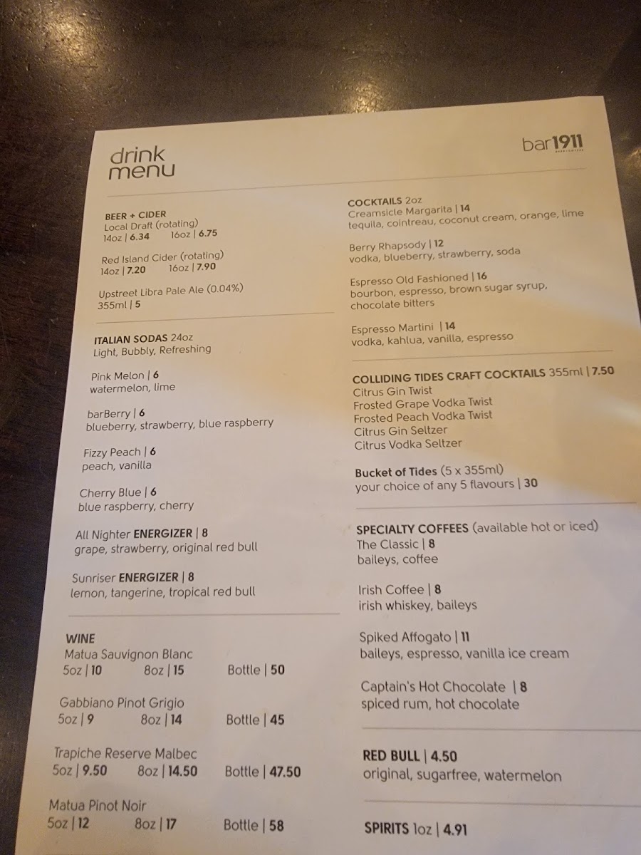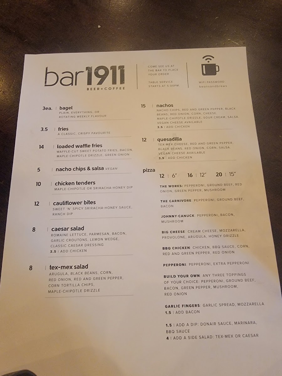 Welcome to bar1911, a charming spot located at 113 Longworth Ave in Charlottetown, PE. This cozy bar/cafe invites you to unwind with its inviting atmosphere, delicious food, and a curated selection of craft beers and coffee.